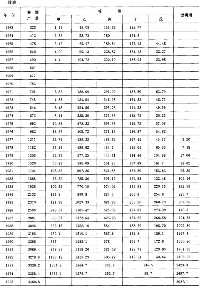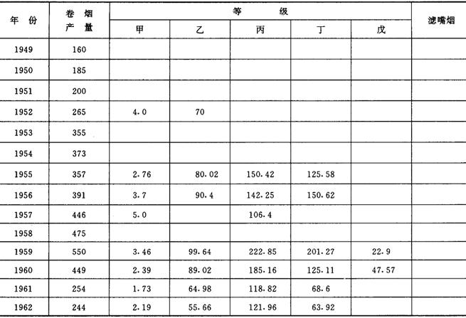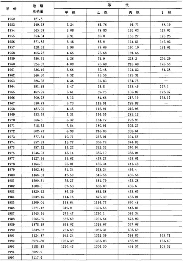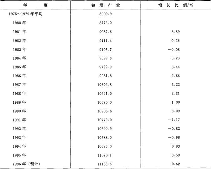 (二)我国的卷烟生产与销售 1949~1995年我国的卷烟产量与销售量,见表2-2-12和表2-2-13。 表2-2-121949~1995年我国的卷烟产量 单位:万箱