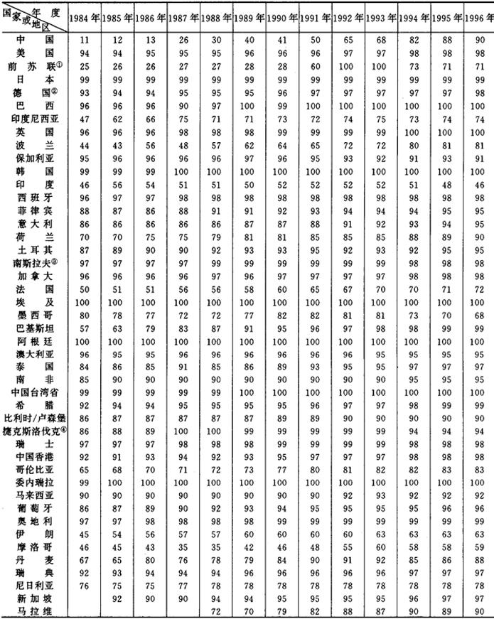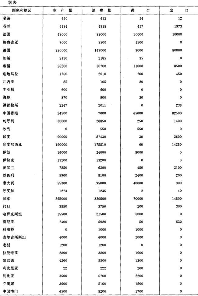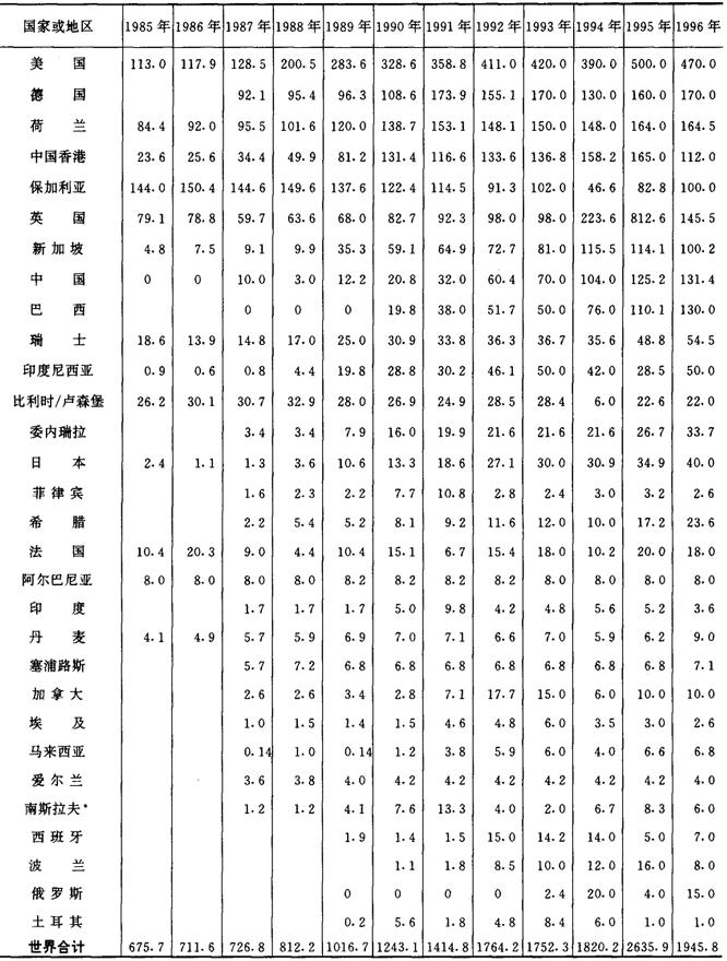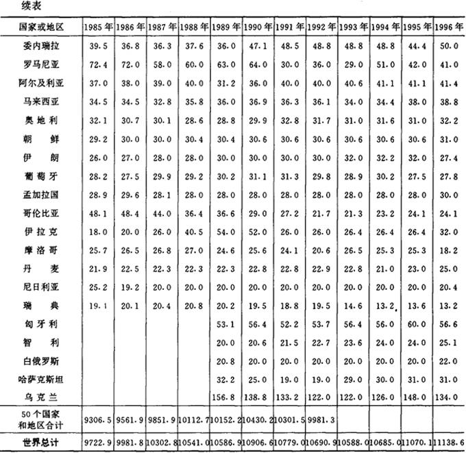 注:1箱=50000支(下同)。 世界主要卷烟生产国家(地区)卷烟产量,见表2-2-2。 表2-2-21985~1996年世界主要卷烟生产国家(地区)卷烟产量 单位:万箱