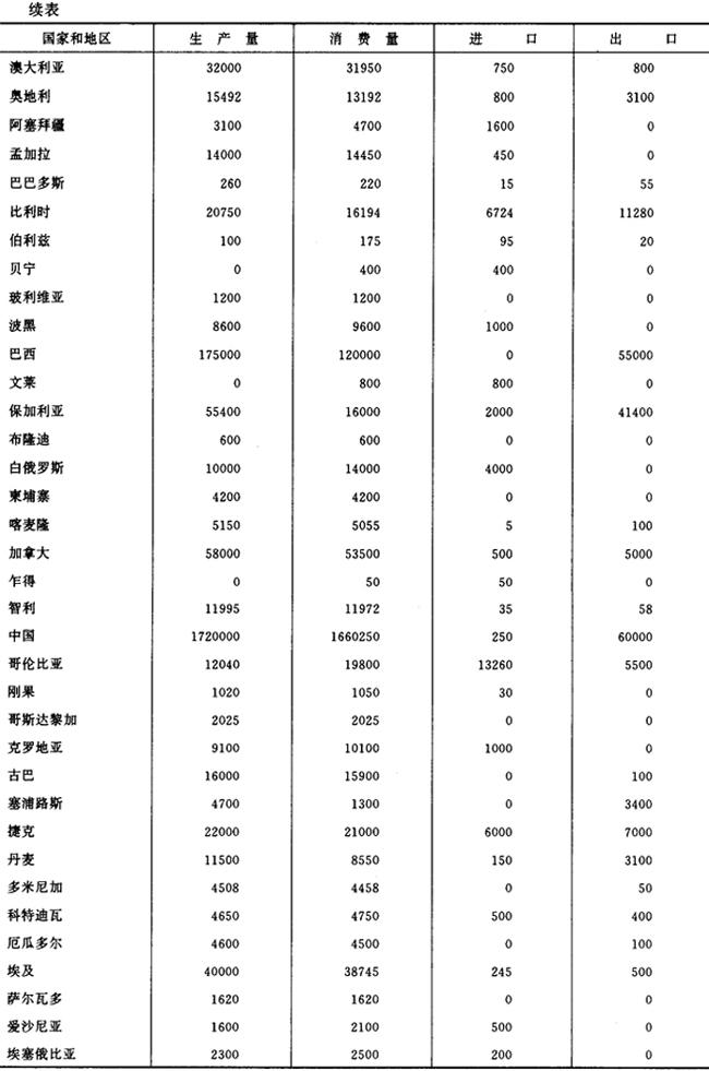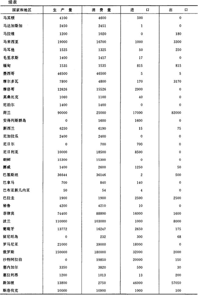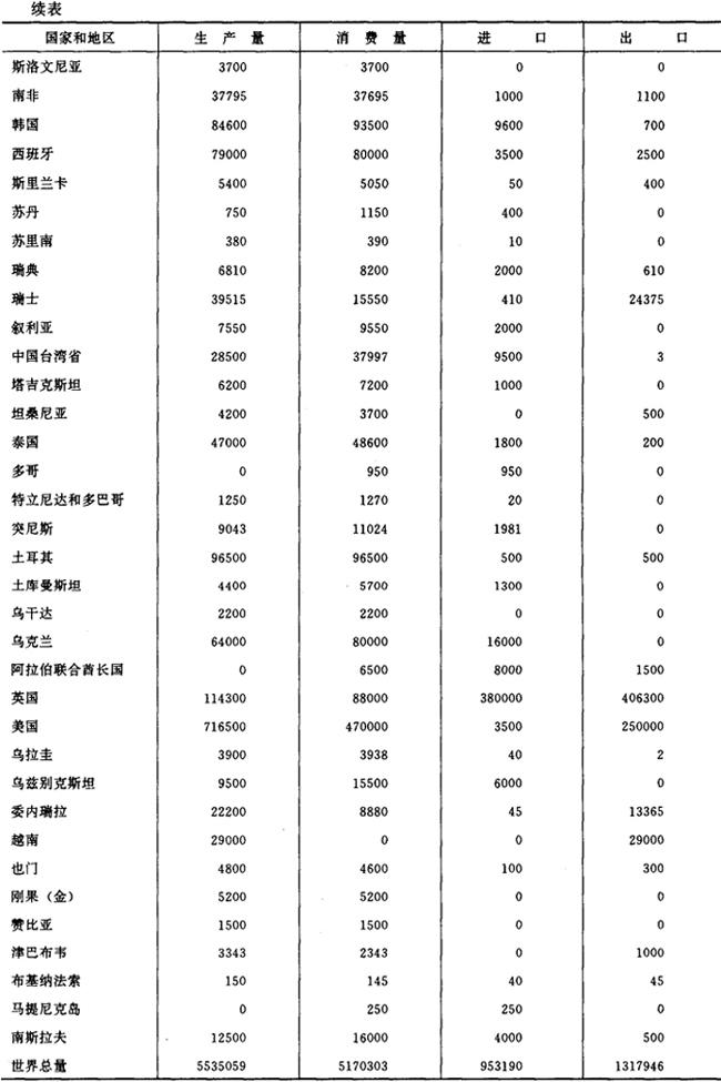 注:①前苏联一栏中1992~1996年的数字为俄罗斯联邦的数据。 ②表中德国1991年前的数字为原东、西德的合计值。 ③南斯拉夫一栏中1992年以前数据为前南斯拉夫的数据。 ④捷克斯洛伐克一栏中1994~1996年的数字为捷克、斯洛伐克两国的合计数字。 1995年世界卷烟生产、消费、进出口统计资料见表2-2-3。 表2-2-31995年世界卷烟生产、消费、进出口统计资料 单位:百万支