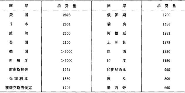 注:①前苏联一栏中1992~1996年的数字为俄罗斯联邦的数据。 ②德国1991年前的数字为原东、西德合计数据。 ③南斯拉夫1992年前的数据为前南斯拉夫的数据。 ④捷克斯洛伐克1994年~1996年数据为捷克、斯洛伐克两国合计数据。 世界部分国家成年人年人均卷烟消费量,见表2-2-5和表2-2-6。 表2-2-520世纪90年代初世界部分国家成年人年人均卷烟消费量 单位:支/(人·年)