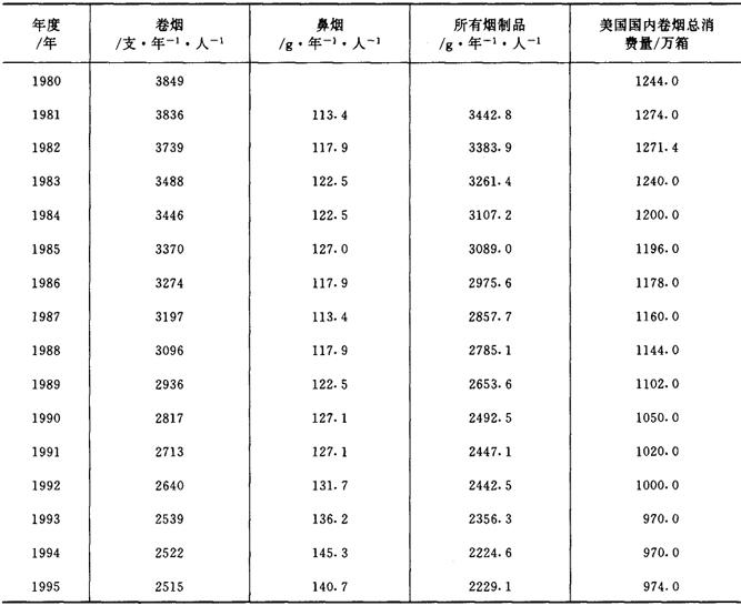 表2-2-6 美国卷烟及烟制品人均(18岁以上)消费量及总消费量