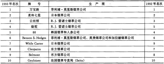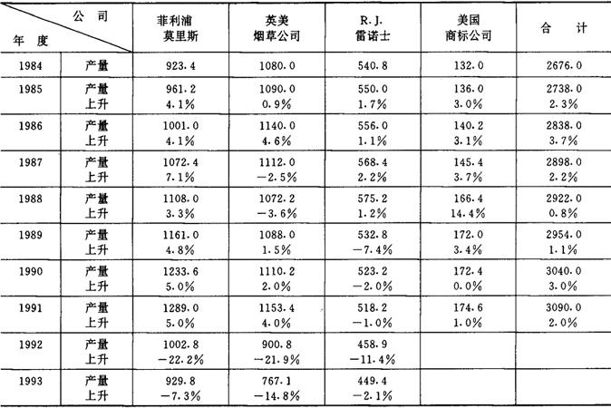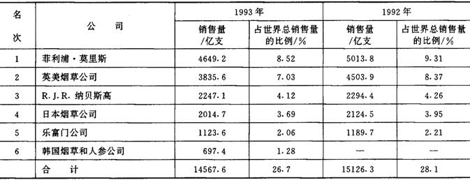 注:表中1992年和1993年的数字为3家公司的年卷烟销售量。 表2-2-8 1992~1993年世界六大烟草公司卷烟销售量及占世界卷烟总销售量的比例