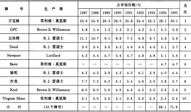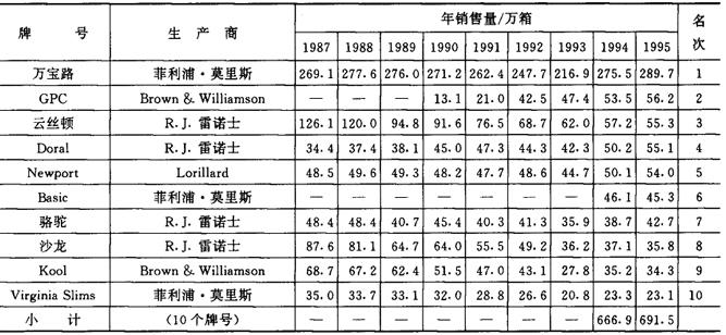 1993年美国市场上销售量最大的10个卷烟牌号和销售量分别为:(1)万宝路,216.9万箱;(2)B&W/Private Lable,75.5万箱;(3)云丝顿,62.0万箱;(4)GPC,47.4万箱;(5)Newport,44.7万箱;(6)Doral,42.3万箱;(7)沙龙,36.2万箱;(8)骆驼,35.9万箱;(9)Kool,27.8万箱;(10)Benson & Hedges,22.9万箱。详见表2-2-10、表2-2-11。 表2-2-10 美国十大品牌卷烟在美国国内市场的年销售量