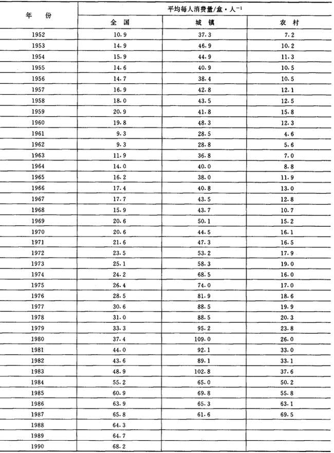 1952~1990年我国年人均卷烟消费量,见表2-2-14。 表2-2-141952~1990年我国年人均卷烟消费量
