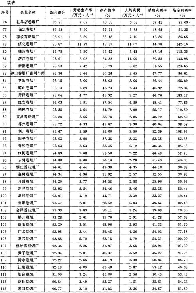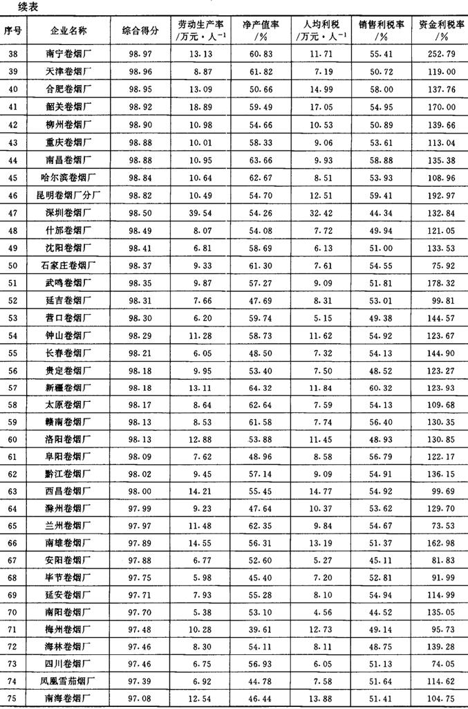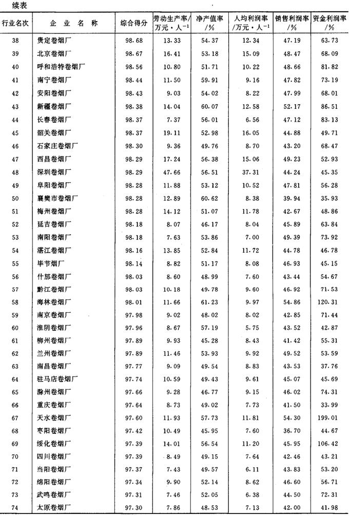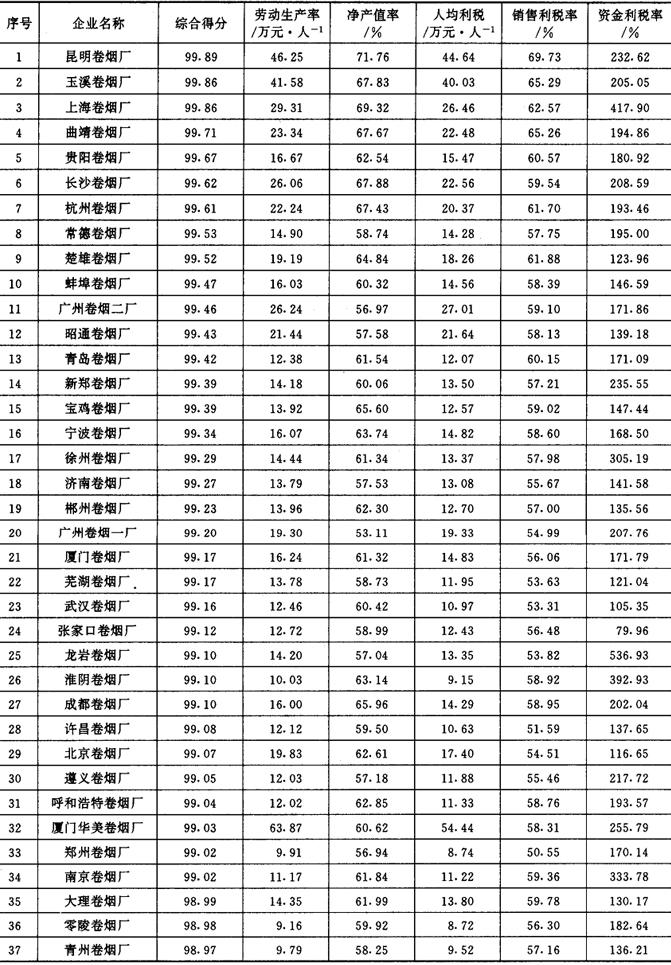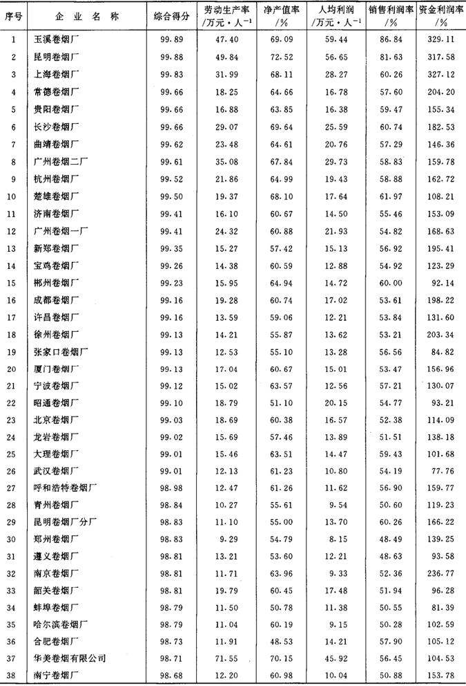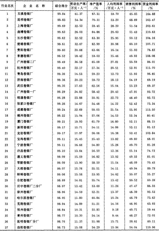 从1987年开始,《管理世界》中国企业评价中心和国家统计局工业交通统计司每年进行一次全国500家最佳经济效益工业企业的排序工作。1989~1992年进入全国500家的烟草企业及其企业劳动生产率、工业净产值率、人均利润(利税)率、销售利润(利税)率和资金利润(利税)率的综合得分见表2-2-15、表2-2-16、表2-2-17、表2-2-18及表2-2-19。 表2-2-15 1989年我国部分烟草企业经济效益资料
