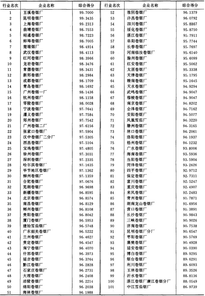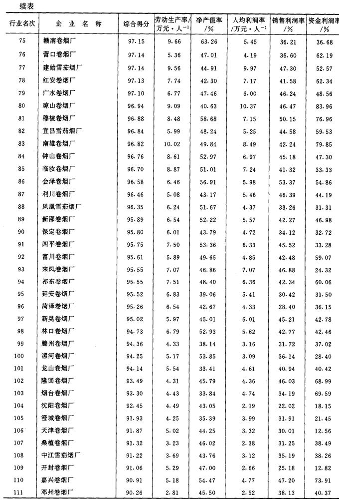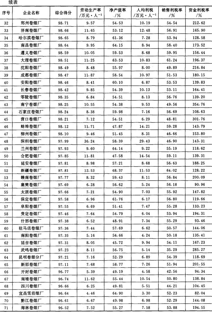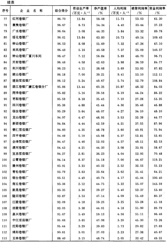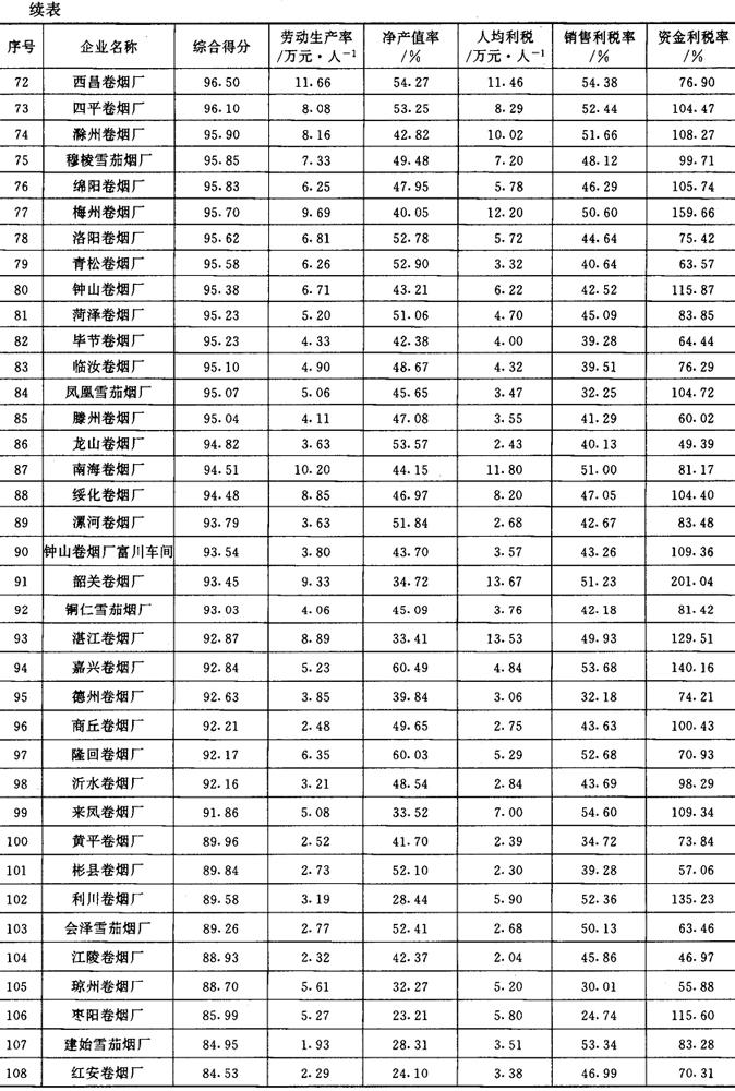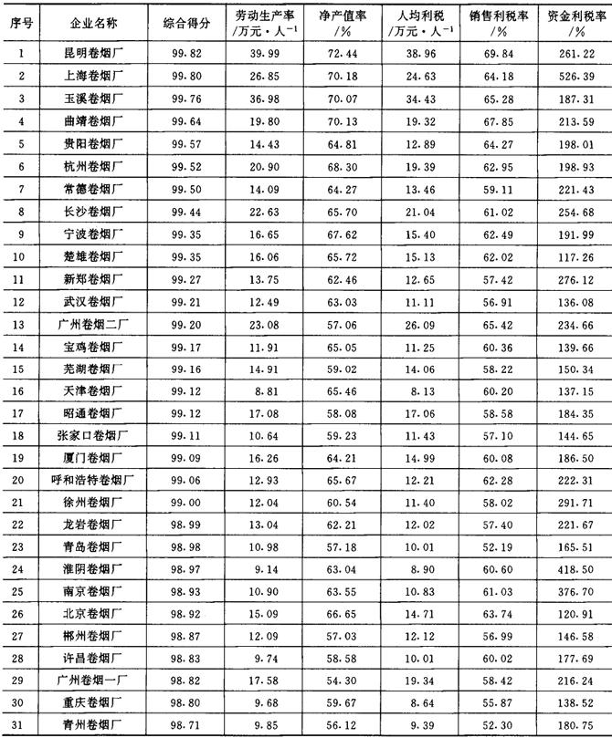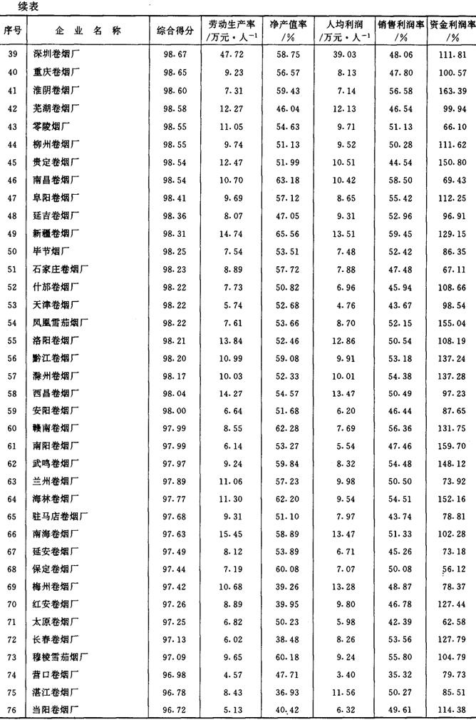 从1987年开始,《管理世界》中国企业评价中心和国家统计局工业交通统计司每年进行一次全国500家最佳经济效益工业企业的排序工作。1989~1992年进入全国500家的烟草企业及其企业劳动生产率、工业净产值率、人均利润(利税)率、销售利润(利税)率和资金利润(利税)率的综合得分见表2-2-15、表2-2-16、表2-2-17、表2-2-18及表2-2-19。 表2-2-15 1989年我国部分烟草企业经济效益资料