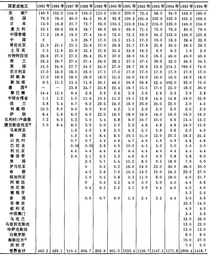 注:①前苏联一栏中1992年以后的数字为俄罗斯联邦的数字,其余数字则为苏联15个加盟共和国的总进口量。 ②德国一栏中1991年以前的数字为原东、西德合并的数据。 ③捷克斯洛伐克1994和1995年的数字为捷克、斯洛伐克两个国家的总和。 ④南斯拉夫一栏中1992年以前为前南斯拉夫的数据。 世界主要卷烟出口国家(地区)卷烟出口情况见表2-2-21。 表2-2-21 1985~1996年世界主要卷烟出口国家(地区)卷烟出口情况 单位:万箱