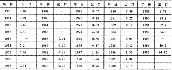 注:表中*表示1992年以前的数据为前南斯拉夫的数据。 1953~1995年我国的卷烟出口情况见表2-2-22。 表2-2-22 1953~1995年中国卷烟出口量 单位:万箱