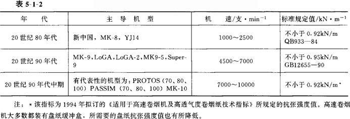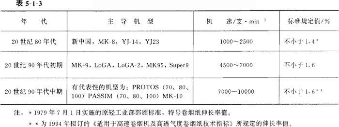 (三)伸长率指标对卷烟的影响 卷烟纸的伸长率与抗张强度类似,其指标低于某一规定值时,在卷烟机运行中易出现断裂而停机。卷烟机型号不同,国家标准中对卷烟纸伸长率指标的要求有所不同,见表5-1-3。 不同时期国家标准规定的伸长率值