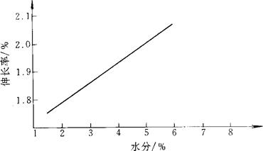(四)灰分指标对卷烟的影响 卷烟纸燃烧后的灰分大部分是填料氧化钙,应呈白色,并着附在烟灰上。卷烟纸的灰分呈黑色,并易散落,则影响卷烟质量。 (五)阴燃性能指标对卷烟的影响 卷烟纸的阴燃性能影响烟支燃烧速度,影响烟支抽吸劲头和香气,还影响烟支的焦油量。不允许卷烟纸的阴燃速度低于烟丝的燃烧速度,以免引起烟支点燃后熄火。 (六)白度指标对卷烟的影响 卷烟纸的白度代表纸的外观,也反映烟支的外观。不允许卷烟纸中加入有燃烧时产生有害气体的荧光增白剂之类的物质。 (七)水分指标对卷烟的影响 卷烟纸的水分含量过高或过低,均会导致卷烟纸抗张强度值降低;在较低的水分含量时,随水分含量的增加伸长率提高(见图5-1-1)。通常卷烟盘纸应放置在空气湿度为60%±5%,温度为20~30C环境中平衡水分至6%。