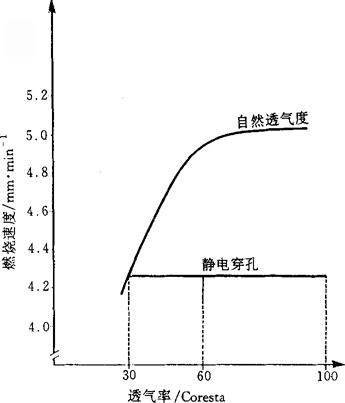 图5-1-2 卷烟纸的透气度对烟支静态燃烧速度的影响 注:在10~60Coresta的范围内,自然透气度每增高10Coresta,烟支静态燃烧速度约增加0.3mm/min。