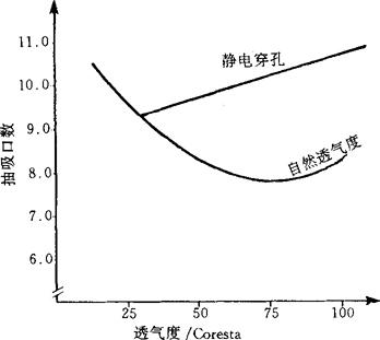 图5-1-1 卷烟纸的水分与伸长率的关系 (八)尘埃度指标对卷烟的影响 卷烟纸的尘埃度影响烟支的外观。 (九)不透明度指标对卷烟的影响 卷烟纸需要一定的不透明度,以免烟丝显露,影响烟支外观。 (十)透气度指标对卷烟的影响 卷烟纸的自然透气度在一定范围内,可提高烟支的静燃速度,并提高烟气的稀释度;可减少烟支的抽吸口数及降低烟支焦油量,还影响卷烟的抽吸劲头与香气。 采用激光打孔、静电打孔等方法提高卷烟纸的透气度,不能增加静燃速度,但可提高烟气的稀释度,烟支焦油也有所降低。见图5-1-2,图5-1-3,图5-1-4。