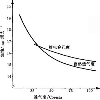 图5-1-4 卷烟纸的透气度对烟支焦油量的影响 注:当卷烟纸的自然透气度在80Coresta以内时,抽吸口数随透气度的增加而减少。当卷烟纸的自然透气度在80Coresta以上时,抽吸口数随透气度的提高而增加。 |