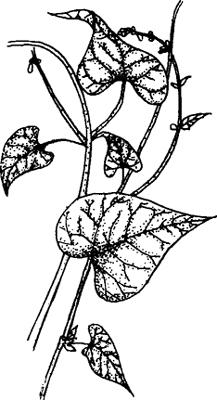 〔形态特征〕 一年生蔓生草本,长1米以上。茎缠绕,细软,有条棱。叶互生,具长柄;叶片卵形,先端渐尖,基部宽心形,全缘,无毛或沿叶脉和边缘疏生短毛;托叶鞘短,斜截形。花序疏散穗状;花少数,簇集于叶腋,花梗较短;花被淡绿色,5深裂,裂片在果期稍增大,有凸起的肋或狭翅。瘦果卵形,有3棱,黑褐色。