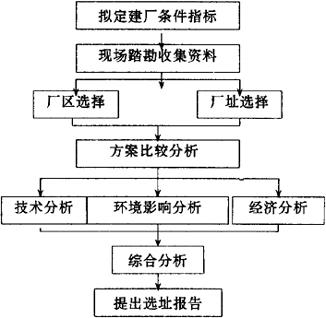 图4.2.2-1 选址程序 (1)拟定建厂条件指标 包括:①总厂基本工程、附属工程、公用工程等占地面积。②全厂用原材料、燃料的种类、数量及质量。③运输量、运输条件和储存要求。④用水量及对水质的要求。⑤用电量以及负荷和等级。⑥高压及低压蒸汽量。⑦全厂定员及生活区占地面积。⑧土建工程内容及工程量。⑨对协作厂要求。⑩气候条件要求。 (2)现场踏勘和收集资料 准备工作就绪后,就应到厂址现场踏勘和调查研究,并尽量搜集有关厂址的各种基础资料。为了避免遗漏,在到现场之前,应由参加选厂的有关专业人员根据工厂规模、产品品种及其特点共同制定厂址基础资料搜集提纲,其主要内容包括地形、气候、水文、工程地质、矿藏、协作、供排水、供电、通讯等技术经济条件,还有交通运输情况及施工条件等。 (3)厂址方案比较 厂址选择必须经过多方案比较,根据踏勘结果和收集的资料从几个不同厂址的技术条件、经济条件列表进行对比(见表4.2.2-1,4.2.2-2),以求得合理的厂址方案。 表4.2.2-1 厂址技术条件比较表