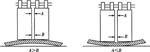 图22.5-2 厅门地坎检查示意 ①如果地坎中间隆起,那么厅门将不能关闭到位。 ②如果地坎两侧翘起,那么厅门将不能开启到位。 ③如果地坎变形和磨损严重,则需要考虑更换。 (3)前后晃动门扇,检查导靴处有无异常响声,检查导靴有无磨损,固定螺栓有无松动。 (4)如图20.2-5所示,如果导靴磨损超过1mm(也就是门扇前后晃动量超过2mm),则需要更换门导靴。 (5)门导靴最好使用六方螺栓固定,因为普通螺栓容易生锈和松动。 (6)如图22.5-3所示,检查地坎安装尺寸: