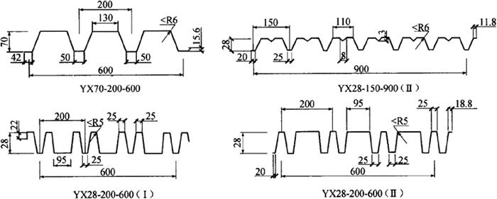 | 释义 | 压型钢板 压型钢板是以冷轧板、镀锌钢板、彩色涂层板为基材,经过成型机的轧制,并涂敷各种耐腐蚀性涂层与彩色烤漆而制成的轻型围护结构材料。这种钢板具有质量很轻、抗震性好、耐久性强、色彩鲜艳、易于加工、施工方便、价格较低等优点。适用于工业与民用及公共建筑的屋盖、墙板及墙壁装贴等。 我国生产的压型钢板共有27种不同的型号。常用压型钢板的板厚为0.5mm,0.6mm。压型钢板波距模数为50mm,100mm,150mm,200mm,250mm,300mm等;波高为21mm,28mm,35mm,38mm,51mm,70mm,75mm,130mm,173mm;有效覆盖宽度的尺寸系列为300mm,450mm,600mm,750mm,900mm,1000mm等。压型钢板(YX)的型号顺序以波高、波距、有效覆盖宽度表示,如YX35-200-750,表示此钢板波高为35mm、波距为200mm、有效覆盖宽度为750mm的压型钢板。几种典型的常用压型钢板板型如图14-2所示。