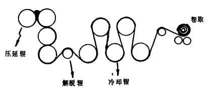 图6-1-1 压延简易流程 本章主要叙述压延设备、软质和硬质聚氯乙烯塑料的压延成型及薄膜的印花等。 |