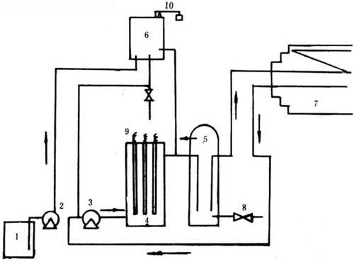 图6-1-18 过热水循环加热系统 1-补给水箱 2-补给水泵 3-循环泵 4-加热器 5-热交换器 6-膨胀器 7-压延辊筒 8-冷却水阀 9-电极 10-安全阀 (四)引离装置 引离装置的作用是将压延机上压成的薄片连续引离压延辊筒的装置,它是由一组旋转的辊筒来实现的,见图6-1-19。引离辊的速度应大于被脱辊,一般约大25~100%,需视压延制品的厚度及软硬程度而定。为了避免引离过程中引离的薄片受到过早的冷却,从而析出增塑剂等,大引离辊内应通入蒸汽(蒸汽压力均为0.7~0.8MPa)。