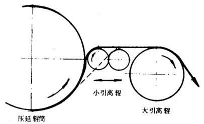 图6-1-19 引离装置示意图 (五)压花装置 如果要求聚氯乙烯薄膜表面带有一定花纹,则可使引离后的薄片通过压花装置。该装置是由一个金属制花辊和一个橡胶辊(肖氏硬度约50~60)相互平行放置作相向旋转而构成,见图61-20。压花时,花辊和橡胶辊中均须通入冷却水,以使其保持在较低的温度,具体温度随配方而定。保持低温的目的是使压制的花纹定型、清晰和减缓橡胶辊的老化作用。此外,辊筒温度高时,还可能出现薄片粘辊的情况。 压花过程中,还须用油压装置从两端将花辊压在橡胶辊上,压力大小可根据制品对花纹的清晰要求而定。