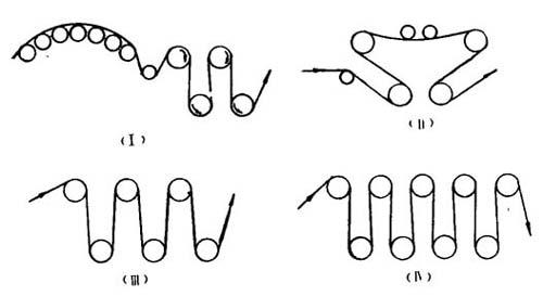 图6-1-20 压花装置示意图 1-导辊 2-橡胶辊 3-压花辊 4-压花辊托架 5-长轴 压延薄片通过压花装置的速度,也就是花辊和橡胶辊的运行速度,必须与引离辊的速度相得平衡,否则也不能完成压花。两辊运行的速度通常为引离辊速的105~110%。 (六)冷却装置 引离或压花后的聚氯乙烯薄膜,还需通过冷却辊冷却定型。冷却定型对制品质量有较大影响,薄膜在卷取前如未达到冷却要求,则会产生发粘、起皱及影响花纹清晰等。在夏季温、湿度高的环境下,如冷却温度过低,冷却辊表面产生露滴,以致薄膜沾有水渍等,从而产生质量问题。 1.冷却方式 按照冷却辊筒排列的不同,通常又有几种不同的冷却方式,见图6-1-21。