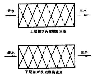 图61-21 冷却方式示意图 Ⅰ——带自然冷却形式(冷却辊线速度为0~60m/min) Ⅱ——不带自然冷却形式(冷却辊线速度为0~60m/min) Ⅲ——中速压延冷却形式(冷却辊线速度为0~90m/min) Ⅳ——高速压延冷却形式(冷却辊线速度为20~200m/min) 2.冷却辊的工艺条件 (1)冷却辊筒的线速度冷却辊筒的线速度一般比花辊稍快,但不宜过快,否则会使薄膜发生冷拉伸,以致内应力集中而严重影响质量。 (2)冷却辊筒的表面温度辊筒表面温度要均匀,但冷却辊往往因进水端温度比出水端低,致使薄膜因冷却不匀而收缩不同,以致发皱,硬片则会产生单边挠曲现象。因此冷却辊筒的浇道应为双螺旋状,而且上下冷却辊筒的螺旋相反,如图6-1-22,这样可以加强冷却效果。并使制品冷却均匀。