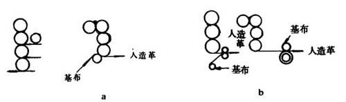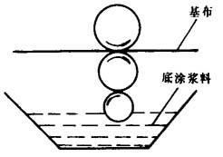 图8-1-24 基布的辊涂 底涂基布的上浆量对人造革质量有较大的影响,一般以基布上涂有薄薄一层浆料为最佳。上浆量过大,浆料过多地渗入到基布纤维的间隙中,就会使基布变硬,用这种基布生产出来的人造革缺乏弹性,不柔软。上浆量太小,又达不到上浆的目的。上浆量也与基布的质地有关,应视基布的品种不同而不同。一般利用底涂辊网纹密度来达到控制上浆量的目的。底涂辊网纹密度一般为120~130目。普通针织布底涂辊网纹密度可用100目。图8-1-25所示为基布底涂上浆情况示意图,其中a的上浆量最为适宜。底涂后的基布在必要时须经烘道干燥。