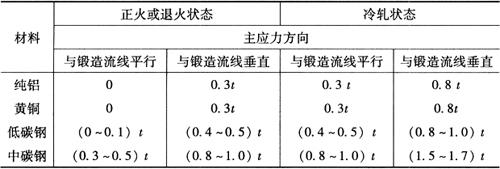 2.最小弯曲系数Kmin 最小弯曲系数Kmin是最小弯曲半径rmin与弯曲件厚度t的比值,又称为最小相对弯曲半径rmin/t,通常用Kmin=rmin/t作为衡量弯曲变形程度的主要指标。 实际生产中主要参照表9-12所示的经验数据确定最小弯曲系数值。表中材料的塑性愈好,弯曲变形的稳定性则愈强,当采用较小的弯曲系数时仍不易弯裂。 表9-12 常用金属材料的最小弯曲系数Kmin