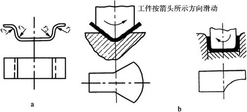 注:本表适用于板厚小于10mm,弯曲角大于90°,剪切断面良好的情况。 若材料的塑性稍差时,应增大最小弯曲系数,并采取退火消除硬化或加热弯曲,提高材料的塑性。 (二)弯曲件形状的设计 1.弯曲外形设计 如图9-36a所示,压弯件形状对称时,弯曲半径也应左右相等、对称布置,使r1=r2,r3=r4,以保证弯曲时毛坯受力平衡无滑动。否则,若弯曲件形状不对称(图9-36b、c),则需在设计模具时,应考虑增设压料板、定料销等板料定位零件,以便防止毛坯弯曲中产生滑动偏移。
