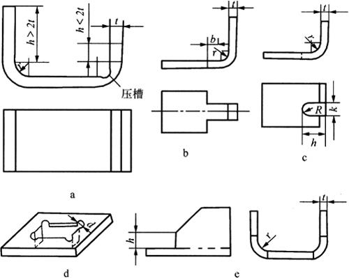 图9-37 弯曲件壁厚设计 a.无加强肋 b.有加强肋 3.弯边高度H设计 当弯边高度较小时,弯边在模具上支持的长度过小,不容易形成足够的弯矩,很难得到准确形状。因此,弯曲角为90°时,应使弯曲边高度H>2.0t,如图9-38a所示。否则,当弯曲处有凸缘时,为防止其尺寸突变尖角处应力集中产生裂纹,应改变形状使突变处离开弯曲线(图9-38b);或在弯曲处先压制槽口及工艺孔(图9-38c、d),再弯曲成型,或者加大此处的弯边高度h,待弯曲后再截去加高的部分。