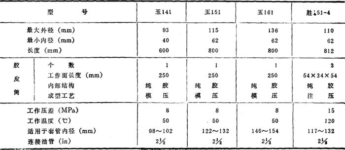 8.水力机械式封隔器 优点:结构比较简单;不要清理井底; 缺点:对套管变形的井,特别是密封段套管变形不宜采用;卸压比较困难。 用途:分层开采。 技术规范见表3-3-44、表3-3-45。 表3-3-44 水力机械式封隔器技术规范