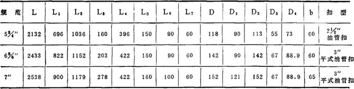 注:(1)工作压差:30MPa, (2)应用范围:适用在中深井,深井下有 (3)试泵:要求清水冷泵试压30MPa经15min不降。 (4)上部接头,7″卡瓦封隔器为310接头扣。 5″、6″、7″卡瓦封隔器结构见图3-3-57。