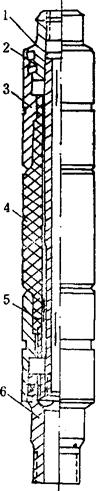 图3-3-59 庆457-8Ⅱ型封隔器 1-上接头 2-密封圈 3-胶皮筒座 4-胶皮筒 5-中心管 6-下接头 庆457-8Ⅱ型封隔器必须与定压单流凡尔配套使用,当油管内外造成0.5~0.7MPa的压差时,胶皮筒即可涨开,密封油、套管环形空间。 川442型等水力压差式封隔器主要技术数据见表3-3-40。 表3-3-40 水力压差式封隔器主要技术数据