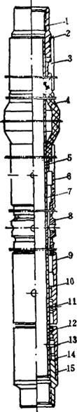 图3-3-60 庆551-60型封隔器 1-上接头 2、12、14-密封圈 3-上胶皮筒座 4-胶皮筒 5-硫化芯子 6-下胶皮筒座 7-中心管 8-调节环 9-拉紧环 10-定位销钉 11-剪钉 13-滑动套 15-下接头 表3-3-41 庆551-6型封隔器技术规范