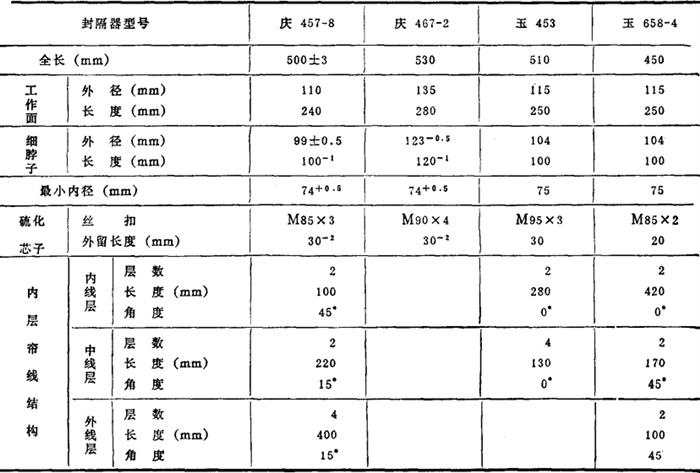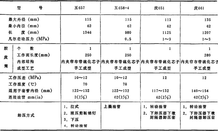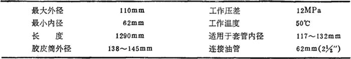 5.水力自封式封隔器 优点:密封性好。 缺点:起封隔器时,胶皮筒不能缩小,只能硬拨,因此容易造成砂卡;必须两个封隔器对装,工艺比较复杂。 用途:分层压裂及分层开采。 庆551-6型封隔器规范见图3-3-60,表3-3-41。