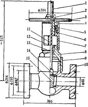 图3-3-65 Φ65×350大气压闸阀 1-护罩 2-螺母 3-手轮 4-轴承盖 5-轴承111 6-阀杆螺母 7-轴承座 8-阀盖 9-自封圈 10-阀体 11-阀杆 12-压帽 13-盘根 14-阀座 16-阀板