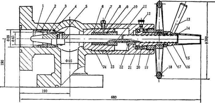 图3-3-68 Φ45×350针阀 1-阀针 2-阀座压圈 3-阀座 4-O型盘根 5-铆钉 6-盘根下座 7-紧定螺钉 8-盘根 9-盘根上座 10-阀盖接头 11-压帽 12-油杯 13-手柄 14-阀杆 15-护罩 16-并帽 17-螺母 18-手轮 19-轴承盖 20-阀杆螺母 21-轴承 22-槽键 23-轴承座 24-阀体