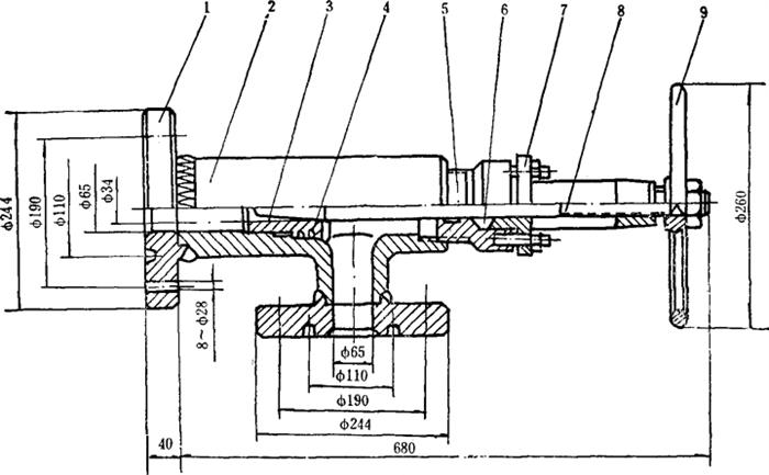 图3-3-69 针阀(试验压力30MPa) 1-法兰 2-阀体 3-阀座 4-O形盘根 5-盘根盒 6-盘根 7-盘根压盖 8-阀杆 9-手轮