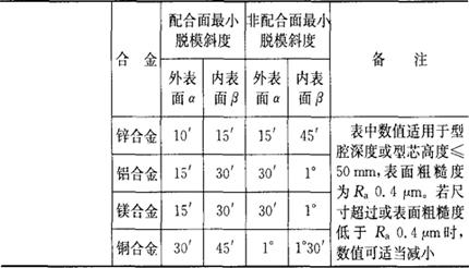 3.脱模斜度 压铸件从压铸模中取出时,为了防止铸件受阻及划伤铸件表面,铸件上所有脱模方向的孔壁和外壁均须具有脱模斜度。表3.2-3列出了脱模斜度的参考值。 表3.2-3 脱模斜度的参考值