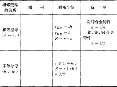 4.圆角 压铸件的截面形状急剧变化的部位,一般都是应力容易集中的部位,应呈圆角,以避免在压铸模和压铸件上造成应力集中而产生裂纹。表3.2-4列出了圆角的计算方法,可以在设计中参考选用。 表3.2-4 压铸圆角半径的计算 (mm)
