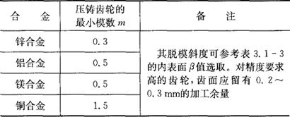 8.齿轮 压铸齿轮的最小模数m见表3.2-8。 表3.2-8 压铸齿轮的最小模数