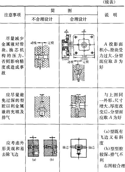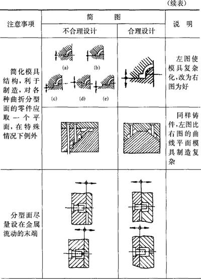 压铸模的动模和定模的接合面,称为分型面。选择分型面时的注意事项,见表3.3-2。