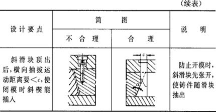 抽芯机构种类很多,现以最常用的斜滑块抽芯机构为例,说明其设计要点(表3.3-7)。