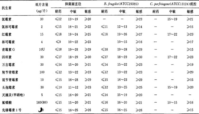 10.敏感度划分的临床意义 (1)高度敏感:当一种细菌引起的感染用某种药常用量治疗有效,这种细菌就对该药高度敏感,即常规用药时达到的平均血浓度超过对细菌MIC的5倍以上。 (2)中度敏感:当细菌引起的感染仅在应用高剂量抗菌药物时才有效,或者细菌处于体内抗菌浓度浓缩的体液(如尿、胆汁)才被抑制,这种细菌对该药呈中度敏感。常规用药其血液药物浓度一般相当于或略高于细菌的MIC。 (3)耐药:药物对某一种细菌的MIC高于药物在血液或体液中可能达到的浓度。 11.纸片法的质量控制 可用标准菌株,如脆弱类杆菌(B.fragilis ATCC 28285)、多形类杆菌(B.thetaiotaomicron ATCC 29741)、产气荚膜梭菌(C.perfringens ATCC 13124)进行质量控制。 (二)国际厌氧菌药敏标准方法(1986)(限量琼脂稀释法) 目前厌氧菌药敏标准方法据美国临床检查标准委员会(NCCIS)和日本化学疗法(JCAM)方案拟定的限量琼脂稀释法进行的,分为简易判断法和常规琼脂稀释法两大类。 1.抗生素的稀释和原液的制备 (1)抗生素稀释所使用溶剂制备成原液,其浓度、保存条件和期限列于表2-5中。 表2-5 抗菌药物原液的配制和保存期限
