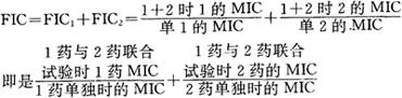 图2-2 以FIC求AB药的MIC (2)列三排稀释,第一排为A药系列,第二排为B药系列,第三排含不同浓度的A及B药。 (3)各孔加入105~106/ml菌液0.1~0.5ml,即等量的试验菌液。 (4)求A药的MIC(或MLC,minimal lethal concentration,即最小致死浓度),B药的MIC(或MLC)和A、B药的MIC,连线作图判断,或求FIC指数来判断联合试验结果。 药物抗菌试验的影响因素包括:①试验菌,最好采用临床新分离菌株,控制菌浓度为105~106/ml,接种量控制在0.1ml以内。②培养基,以WC或GAM培养基为准,pH控制在7.2左右。③抗菌药物,注意完全溶解和精确配制,注意中药中含鞣酸和色泽会影响透明度。 |