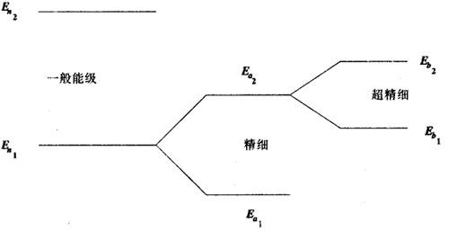 图8.2-4 原子在能级上的分布 由图看出,绝大多数原子都处于基态上,激发态愈高,原子数愈少。原子在一定的外界条件刺激下,可以从一个能级跳到另一个能级,即从一种运动状态改变到另一种运动状态。这种过程称为原子的跃迁。如果外界刺激是电磁波(光也属于电磁波)时,则发生的跃迁称为辐射跃迁。原子秒的定义以及各种原子频标所用的都是辐射跃迁。 当原子从低能级跃迁到高能级时要从外界吸收一部分能量,反之就放出一部分能量。但跃迁是有条件的,只有当外界激励信号的频率满足下列条件时,跃迁才能发生: hv=E2-E1 (8.2-1) 式中 h为普朗克常数; v为激励信号的频率; E2,E1分别为跃迁的两个能级值。换句话说,当原子跃迁时,无论是从外界电磁波吸收能量,还是以电磁波形式放出能量,这些电磁波的频率必须满足上式关系。从式中看出,h为常数,理论证明原子的能级是非常稳定的,因而所对应的电磁波的频率,或者其倒数-周期也是非常稳定的,由此引发人们利用这种振荡的周期建立时间基本单位。 2.实际要求 理论上,任何一种元素的原子在任何两个能级间跃迁时,所放出或吸收的电磁波的频率都遵循8.2-1式,即都是非常稳定的,都可用于定义原子秒。但在复现上会受到现有技术条件及科学水平的限制。从实际复现角度应考虑: (1)所选的元素其原子的能级应尽可能简单。8.2-1式中的E2,E1是计算得到的,原子能级愈简单,计算的准确度愈高。 (2)所选的发生跃迁的两个能级之差应尽可能小。差值愈小,对应频率愈低,技术上愈容易实现。 (3)所选用的跃迁能级上的原子应尽可能多,以便得到较强的跃迁信号。 从第(1)点要求看,氢元素的原子结构最简单,只有一个电子。其次是碱金属元素,即锂钠钾铷铯等,也只有一个价电子。这些元素的原子的能级都易于准确计算。但在实际研究中发现铯原子跃迁时,各种因素的影响较小,且可准确测定其影响量,故最后决定用铯原子跃迁时辐射的周期定义秒。铯-133是天然存在的易得到的很纯的同位素。 考虑第(2)点的要求,当原子在基态和激发态之间或在两个激发态之间跃迁时,所对应的频率都非常高,都在光频范围,从技术上难于准确控制。只有在两个超精细能级间跃迁时,对应的频率才落在技术上已很成熟的无线电微波范围内。此外,从第(3)点要求,在正常情况下,大量的原子都处在基态上。故在原子秒的定义时选用了基态上的两个超精细能级。 前边分析的原子的能级只是粗略的一级近似。即只考虑电子与原子核间的静电势能(电子的动能与此相比其值很小)。实际上电子在绕核转动时相当一闭环电流,因而会产生磁场,此外电子除绕核公转外,本射还在自转(自旋),自转的方向又有两种,这种自转也会产生磁场。公转磁场与自转磁场之间发生相互作用,使电子在静电势能上又叠加上了一部分磁能。这样原来一级近似的能级就会分成两条新的能级,称为原子的精细能级,由于磁能很小,故精细能级之差比原来的能级差要小3个数量级。 再进一步深入研究,发现正电荷在原子核内的分布不能看作为一个点,故产生的电场不能简单的用点电荷电场处理,与电子相互作用的静电势能也发生了变化。此外,原子核本身也在自旋,也会产生磁场,这个磁场与电子运动的磁场相互作用的结果,使磁能也发生了变化。考虑了这两种作用后,原子的精细能级又会分成超精细能级,后者能级差又比前者能级差小3个数量级。如图8.2-5所示。