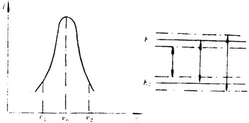 图8.2-6 跃迁曲线 从前边的理论关系式8.2-1可以得出:如果两个能级E1和E2的值是唯一的确定值,则跃迁曲线应是一条直线。实际上,无论那条能级都不是唯一的一个确定值,在能级图上并不是绝对的一条直线,而是有一定的宽度,如图8.2-6(b)所示,这种加宽的原因一是能级固有的,另一是实现跃迁时各种外界因素的影响。而8.2-1式的关系是完全不变的。于是就产生了图中所示的跃迁曲线。不同的能级差对应不同的跃迁频率。 原子跃迁曲线类似于普通振荡电路的谐振曲线,故发生原子跃的部分可简称为原子谐振器。由于是受激跃迁,故秒定义的复现装置由两大部分组成,一是原子谐振器,另一是激励信号发生器。在跃迁曲线上只是中心频率是准确已知的,即v0=9192631770Hz,故必须加上控制部分调节激励信号的频率,使跃迁始终发生在中心频率对应的能级上。整套装置如图8.2-7所示。较详细的工作原理将在原子频标一节内介绍。