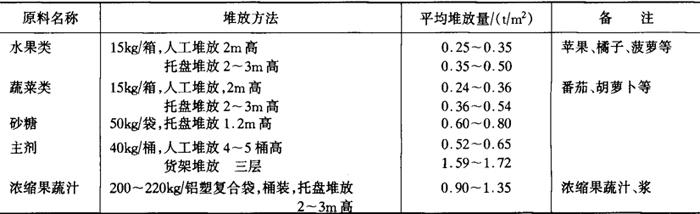 | 释义 | 原料库 饮料厂原料库包括常温库及冷库。原料常温库主要贮存砂糖及部分辅助材料(如食品添加剂、活性炭等)、果蔬原料与蛋白质饮料的原料(如大豆、杏仁等)。原料冷库主要贮存碳酸饮料用主剂、浓缩果蔬汁和需要冷藏的果蔬原料。按用途还可分成高温冷藏库及低温冷藏库。 部分原料仓库平均堆放量见表6-5-2。 表6-5-2 饮料厂原料库部分物品平均堆放量