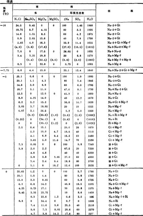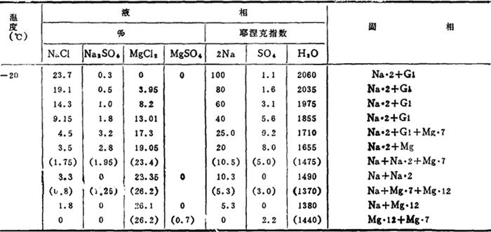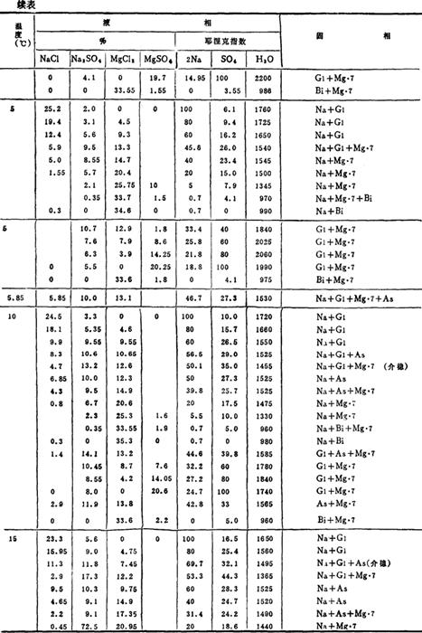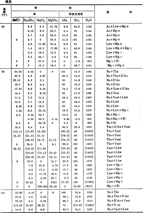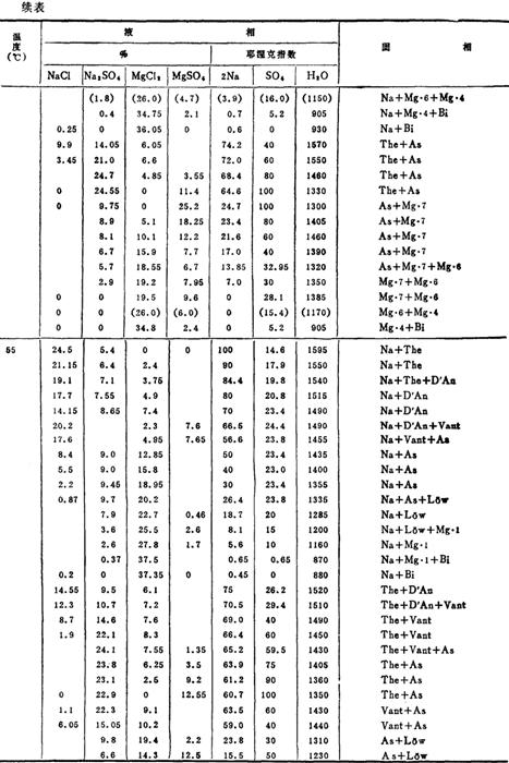 注:Na:NaCl Na·2:NaCI·2H2O Mg·8:MgCl2·8H2O The:Na2SO4 Mg·12:MgCl2·12H2O Gl:Na2SO4·10H2O Bi:MgCl2·6H2O Mg·1:MgSO4·H2O As:Na2SO4·MgSO4·4H2O Mg·4:MgSO4·4H2O D′An:9Na2SO4·MgSO4·3NaCl Mg·5:MgSO4·5H2O Vant:3Na2SO4·MgSO4 Mg·6:MgSO4·6H2O LÖw:Na2SO4·MgSO4· Mg·7:MgSO4·7H2O 根据表6-4-1的部分数据绘制图6-4-1A和图6-4-1B。