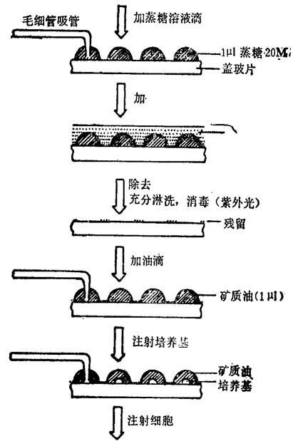 图3-2 制备微滴过程 琼脂培养法,无论是原生质体与0.6%琼脂混合前在液培时再生细胞壁,或是在原生质体游离后,立即放在琼脂培养基上。我们应用的方法是将原生质体同等体积的处在45℃的琼脂培养基混合,此法已成功地应用于烟草原生质体培养。然后把少量原生质体琼脂混合物制成平板。使用这个方法,原生质体处在固定位置,所以避免原生质体集积,可以追踪分开的克隆。 琼脂培养方法结合饲养原生质体的想法能提高某些难培养原生质体的植板效率。Raveh等(1973)把经x-辐射的无分裂能力的烟草原生质体,与低密度的正常而有活力的烟草原生质体混合,然后把有活力和无活力原生质体混合物制成0.6%琼脂平板。也可采用饲养层法,即把经x-辐射不能分裂的饲养细胞先与0.6%琼脂混合,然后植板,再将有活力原生质体与0.6%琼脂混合,把它成层植板在x-辐射饲养层细胞上面。 另一个原生质体培养技术是,已报道复合培养能改良某些植物的原生质体植板效率。将迅速生长的如烟草悬浮培养物的原生质体同十分难培养植物的原生质体以不同比例混合。这个迅速生长的原生质体可能给另一种原生质体提供生长因素和未知化学物质,它们有利于原生质体的细胞再生和细胞分裂。同样地,Menczel等(1978)用微量吸管技术分开原生质体衍生的单个细胞,并把它们转移到白化细胞的看护培养物上。根据克隆颜色,可以区分从单个原生质体产生的绿色克隆和白化细胞产生的白化克隆。Menczel等(1978)用这个方法发现了随原生质体融合后产生的分开杂种细胞。 悬滴方法能培养每个滴比常规小滴方法较少的原生质体。这个方法简化了小群原生质体分析,它可在倒置的液体0.25—0.50μl液滴中培养原生质体。培养单个原生质体更适宜方法有Kao(1977)和Gleba(1978)使用过的微分离方法。这个方法是机械地分开成单个原生质体,放在分开的培养池中,然后,能长期追踪这些单独原生质体。Cuching(1982)提出运用显微操作器人工选取单个原生质体进行分别培养,更适于追踪各个原生质体的发育状态和其再生植株或融合杂种细胞的遗传变异。 (四)原生质体活力试验 检测原生质体活力的最常用染色方法有酚藏花红和荧光增白剂,当在细胞膜中积累萤光素二乙酸(FDA)时,在5min内,活的完整原生质体发出黄绿色萤光。溶解在5.0mg/l丙酮中的FDA加到原生质体培养体,使最终浓度为0.01%。原生质体破裂散出的叶绿素发出红色萤光。因此,原生质体制剂中的活原生质体百分率容易统计。虽然,用FDA处理的原生质体必需在染色后5—15min之间进行检测,因15min后,FDA从膜中游离出来。 酚藏花红也是用0.01%最终浓度,它对死亡原生质体是专化的。把它与原生质体制剂混合后染色,无生活力原生质体立即染成红色。活原生质体仍未被酚藏红染色,即使染色30min后也仍不染色。 或许是最普遍应用于检查原生质体活力的染色,它能检测开始细胞壁再生。荧光增白剂(CFW)束缚新合成细胞壁中的葡萄糖苷的β-键。当0.1m1原生质体与0.5μl0.1%的CFW溶液混合实现适宜染色。用质膜周围萤光环观察细胞壁合成。也可用CFW染色细胞分裂板。 用于检定原生质体活力的其他方法有:观察胞质环流,排斥Evans蓝染料,随渗透改变的原生质体体积变化,氧吸收研究和光合作用活性。 原生质体活力试验是重要手段,特别是当为了生化研究的原生质体制备。虽然,原生质体的真正活力是原生质体能通过持续有丝分裂,再生成愈伤组织,并最终再生成植株。 (五)细胞壁形成和持续分裂 一般认为细胞壁再生是核和细胞分裂的先决条件。然而,至少有一个例子,无细胞壁再生时,也观察到核分裂。用电子显微镜研究了培养烟草原生质体的细胞壁再生过程,这些研究指出,新游离的原生质膜含有突出的微管,它在新合成纤维素微丝的方向上有作用。这些纤维素微纤丝是在烟草对数生长期2天后合成的。Asamizu等(1977)报道,纤维素微纤丝首先合成的比以后合成的短,其中新合成的一些纤维围绕微管的方向。这个偶然的纤维素基质终成加厚,纤维方位与质膜平行,导致形成连续细胞壁。 细胞壁再生的速率和调节,决定于植物种类和用于原生质体游离的受体细胞的分化状况。烟草属、矮牵牛属、蔓陀罗属和芸薹属的叶肉原生质体都很快形成新细胞壁。在24h内,在光学显微镜下观察到圆形原生质体变成卵圆形,并可用CFW染色检测到细胞壁。另外,有的报道,禾谷类和豆科植物叶肉原生质体不能形成细胞壁。 在一些种植物上观察到称为原生质体出芽的不完全细胞壁再合成。发生出芽被认为是由于果胶未进入新细胞壁,并且是出现在新合成细胞壁的薄弱区。 控制细胞壁合成,除了遗传因子之外,培养基成分对细胞壁再生也是重要的。例如,蔗糖浓度超过0.3M和山梨醇超过0.5M时,抑制细胞壁形成。在难培养成功的植物中,如燕麦,加入某些化学药品对细胞壁再合成和细胞分裂是重要的。证实某些种植物,细胞壁的再合成要求一定生长调节剂。然而,常用的生长调节剂如2,4-D和ZEA对细胞分裂的调节作用显然比细胞壁再生更重要。 第一次细胞分裂依赖于壁的形成,但在少数植物上,看到细胞分裂早于壁的形成。许多因子对开始细胞分裂是重要的,如受体植物的基因型、培养基、环境培养条件和用于原生质体游离的受体组织条件。例如,用迅速生长的常常通过第一次分裂的细胞的细胞培养体游离原生质